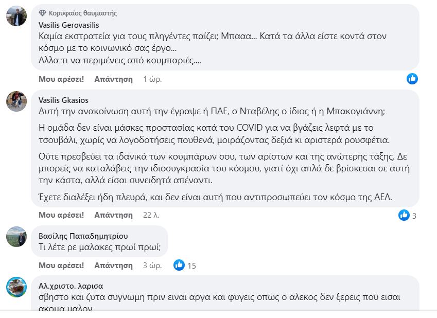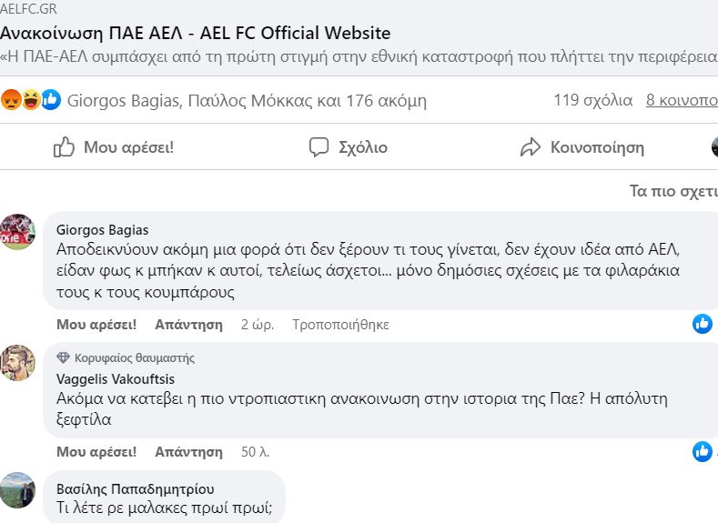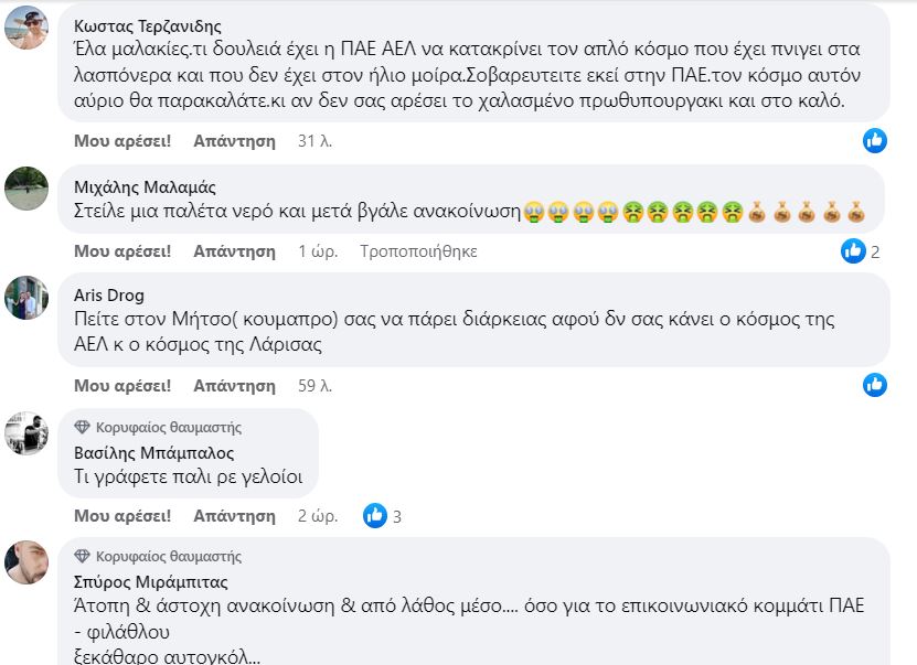 Αυτά είναι λίγα από τα δεκάδες σχόλια που έχουν γράψει οπαδοί της ΑΕΛ κάτω από τη δημοσίευση: