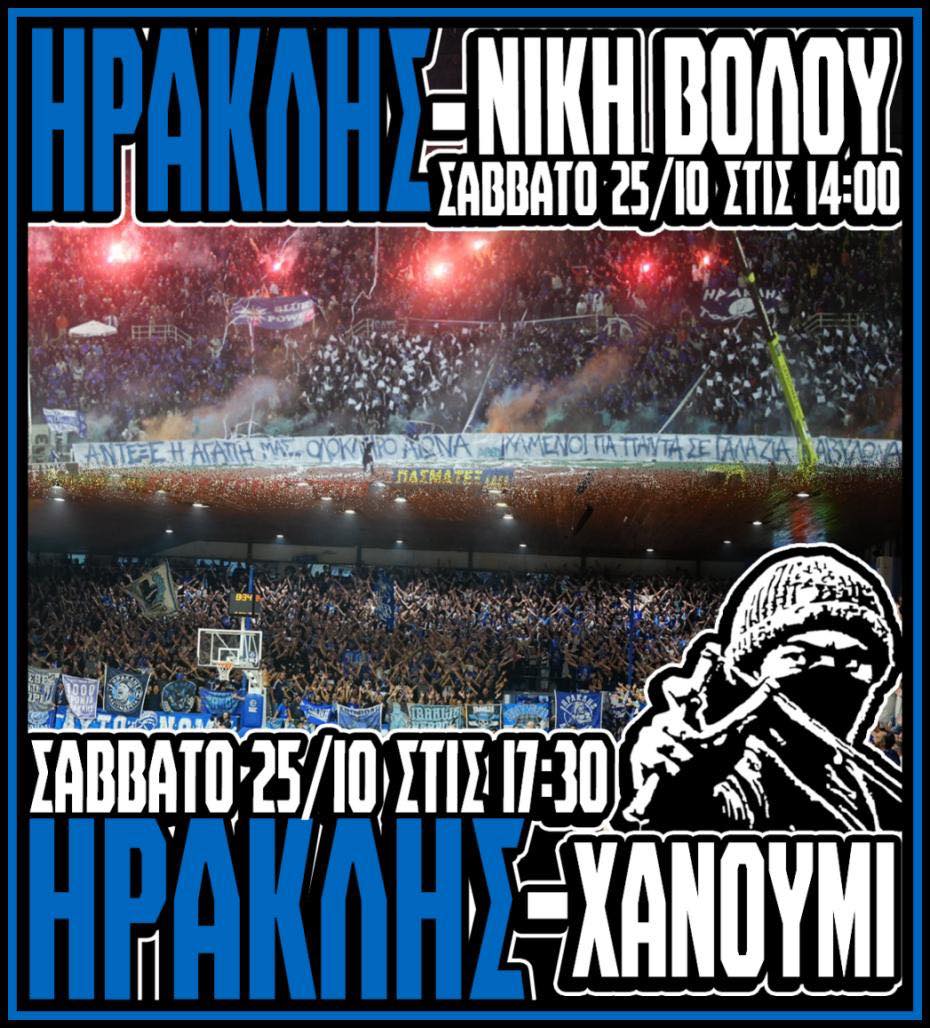Λαέ του ΗΡΑΚΛΗ , το Σάββατο 25/10 οι ομάδες μας δίνουν δύο πολύ κρίσιμους αγώνες σε ποδόσφαιρο και μπάσκετ. Ξεκινώντας από τη μπάλα , μην ασχολείστε με τίποτα , μην ασχολείστε με επικοινωνιακά κολπα που προσπαθούν να μας αποπροσανατολισουν.