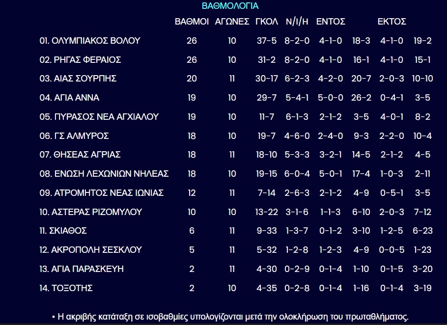 Η βαθμολογία της Α’ ΕΠΣΘ
