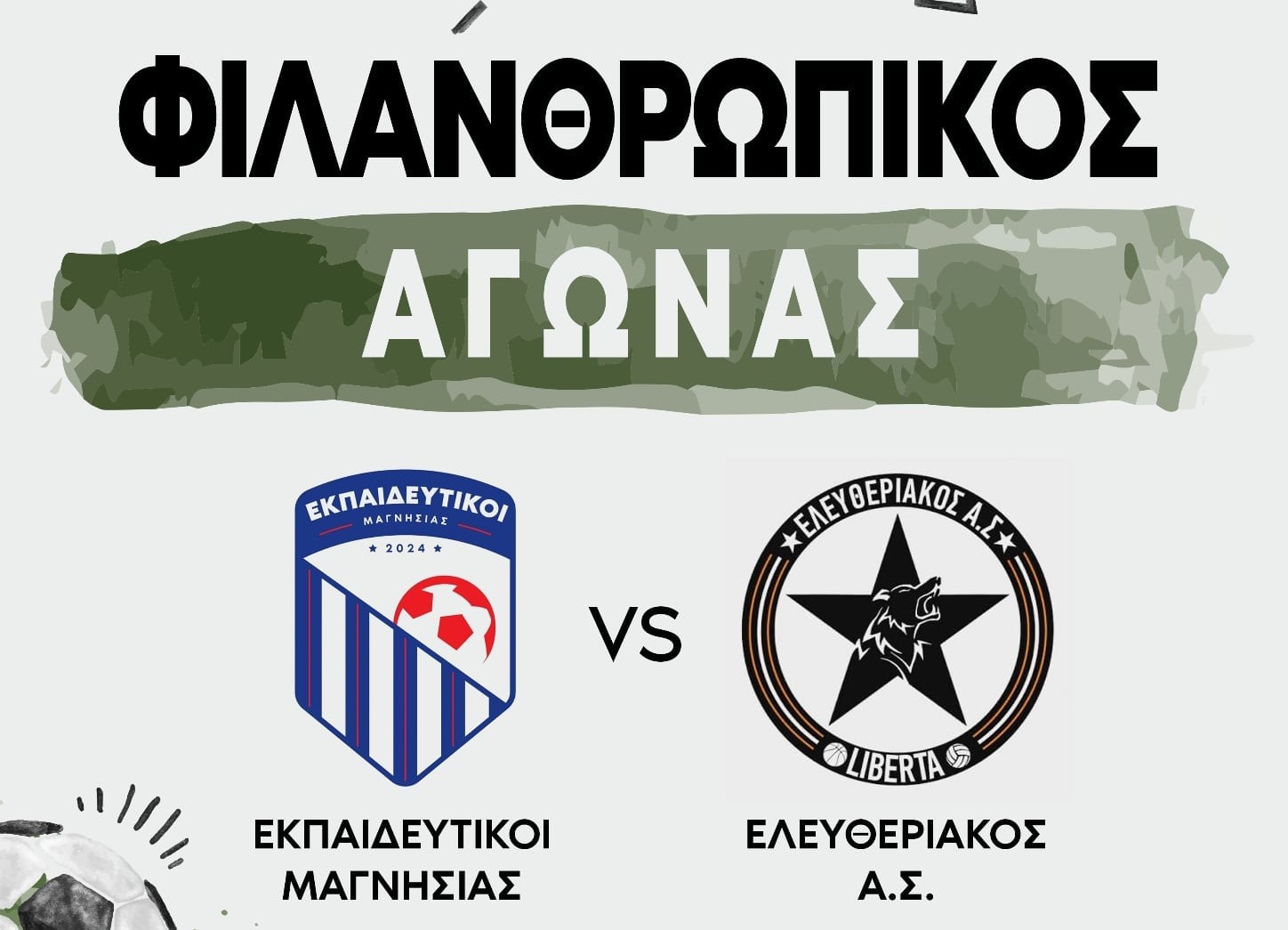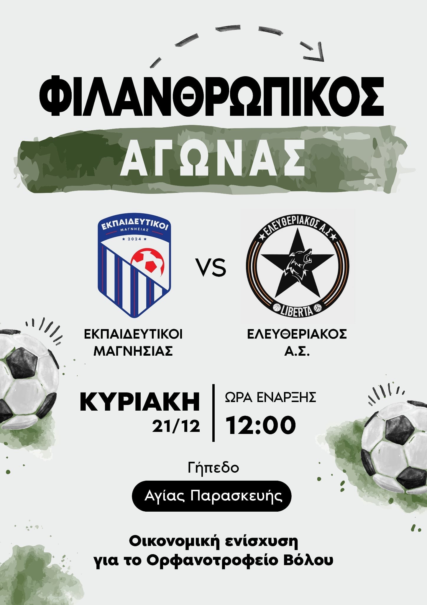 Την Κυριακή στις 12 το πρωί στο γήπεδο της Αγ.Παρασκευής η νεοσύστατη ποδοσφαιρική ομάδα των Εκπαιδευτικών και η τοπική ομάδα Ελευθεριακός θα αγωνιστούν για να στηρίξουν οικονομικά το Ορφανοτροφείο του Βόλου.