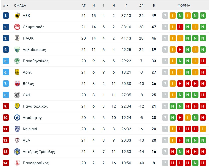 Τέλος, ο Παναθηναϊκός (33β.) έμεινε στο 1-1 με την ΑΕΛ Novibet στη Λεωφόρο και το -6 από τον Λεβαδειακό (39β.) που είναι στην τετράδα δεν άλλαξε, με το «τριφύλλι» να έχει το