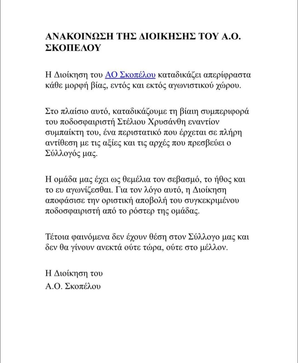 Η νησιώτικη ομάδα απέβαλλε από το ρόστερ της τον Στέλιο Χρυσάνθη, ο οποίος σύμφωνα με την ανακοίνωση, είχε βίαιη συμπεριφορά εναντίον συμπαίκτη του.