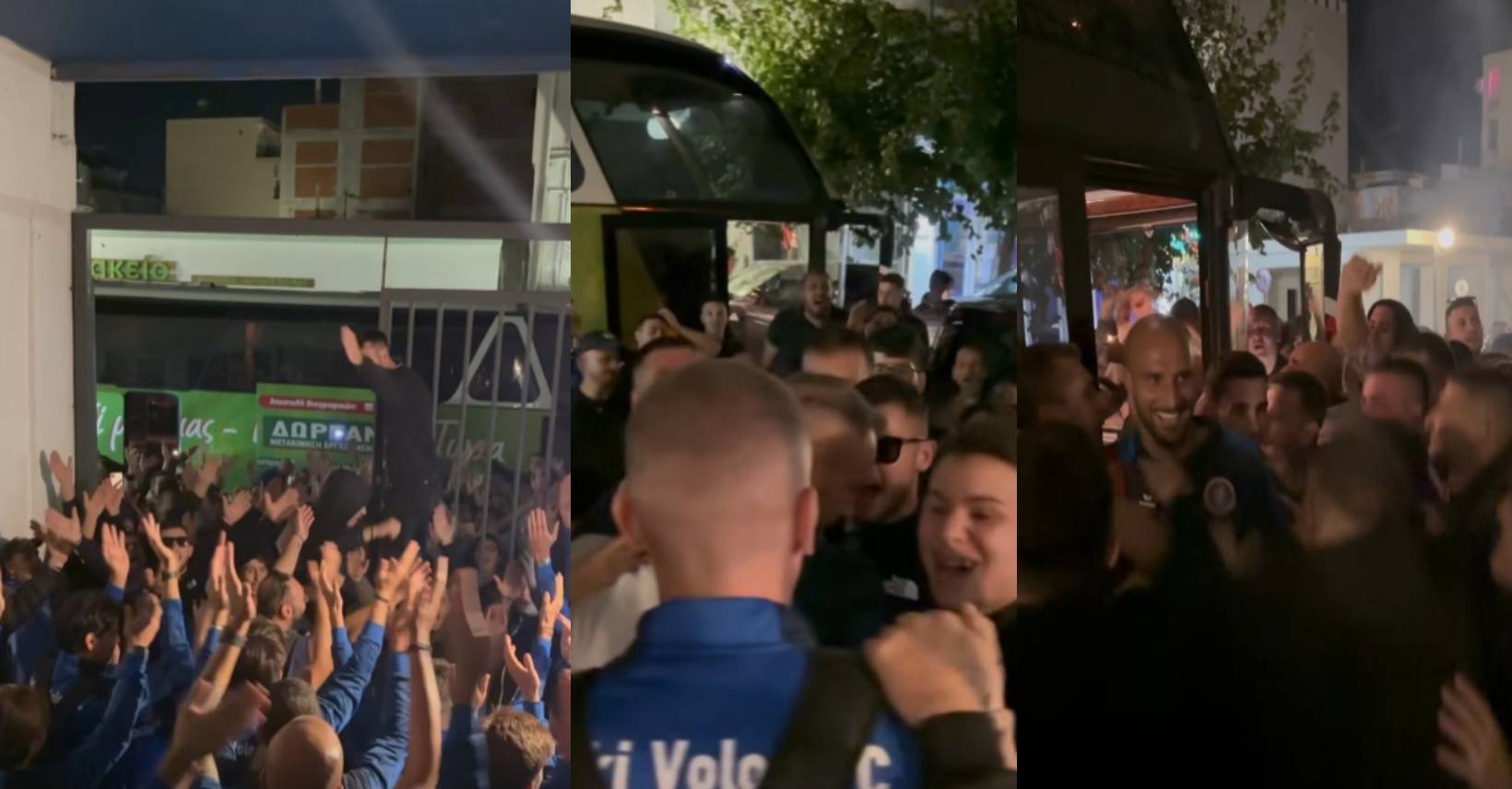 “Νάτοι, νάτοι οι πρωταθλητές” και “Έκανες τον Ηρακλή κουρέλι, Γκαραβέλη” δόνησαν την ατμόσφαιρα έξω από το “Π. Μαγουλάς” όταν έφτασε το λεωφορείο της βολιώτικης ομάδας.