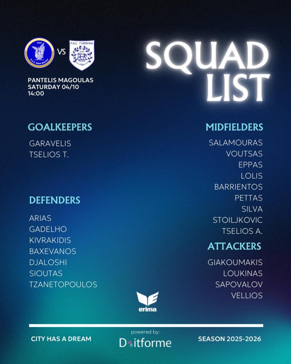 Ο Κώστας Γεωργιάδης, μετά το πέρας της, ανακοίνωσε την αποστολή για το παιχνίδι της 4ης αγωνιστικής της Super League 2 αύριο Σάββατο 4/10 στις 14:00 στο γήπεδό μας, υπολογίζοντας συνολικά σε 22 ποδοσφαιριστές.