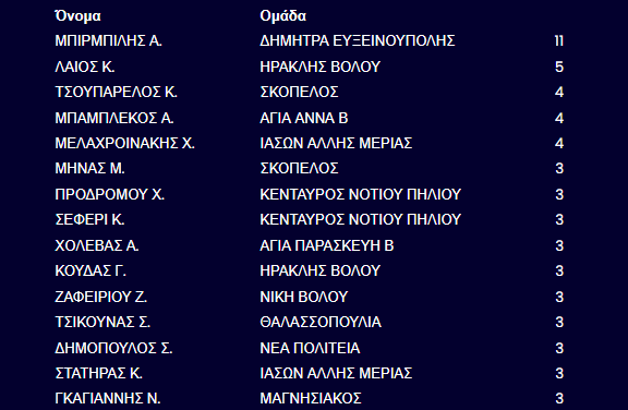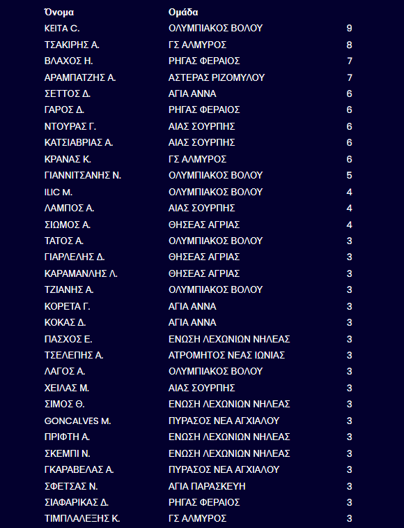 Στην Α’ ΕΠΣΘ ο Μαμαντού Κεϊτά του Ολυμπιακού Βόλου με 9 τέρματα οδηγεί την κούρσα των σκόρερ, με τον Τσακίρη του Γ.Σ. Αλμυρού να ακολουθεί μ’ ένα γκολ διαφορά. Ο Ηλίας Βλάχος του Ρήγα και ο Θανάσης Αραμπατζής του Αστέρα Ριζομύλου, με 7 τέρματα ο καθένας βρίσκονται στο τρίτο “σκαλί” του πίνακα.