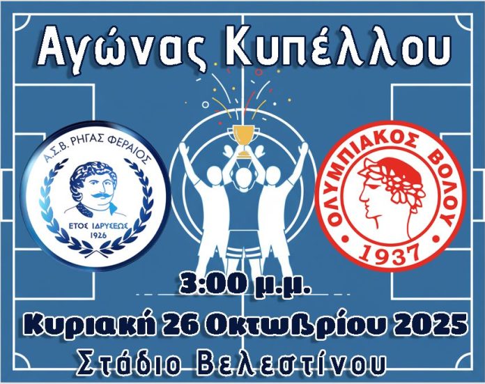 Ο Ρήγας Φεραίος καλεί τον φίλαθλο κόσμο να στηρίξει την ομάδα του Βελεστίνου στον αγώνα Κυπέλλου με τον Ολυμπιακό Βόλου, τον οποίο χαρακτηρίζει ντέρμπι γεμάτο ένταση, πάθος και ιστορία.