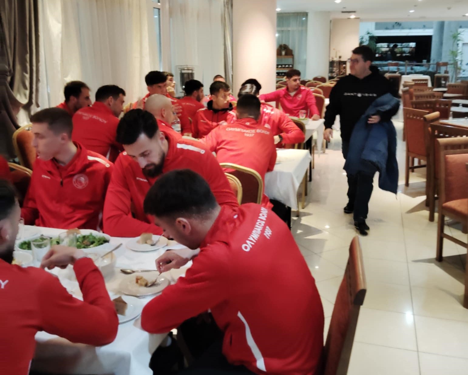 Στο δείπνο που πήραν οι ποδοσφαιριστές, το προπονητικό τιμ και οι συνοδοί της αποστολής φάνηκε για μία ακόμη φορά το άριστο κλίμα που επικρατεί στον Ολυμπιακό. Στη συνέχεια οι παίκτες θα ξεκουραστούν για να είναι απολύτως έτοιμοι για να ανταπεξέλθουν στις απαιτήσεις της αυριανής αναμέτρησης.