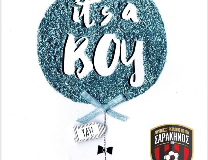 “Ο Α. Σ. Σαρακηνός εύχεται στον προπονητή της ομάδας, Στέφανο Ξηροφώτο, και τη σύζηγό του, για τον ερχομό του υγιέστατου παιδιού τους, ότι καλύτερο. Να σας ζήσει, με υγεία και να είναι καλότυχο!”