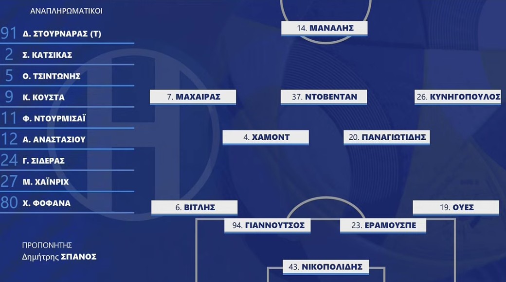 73′ Κούστα στη θέση του Μαχαίρα και Ντουρμισάι αντί του Κυνηγόπουλου