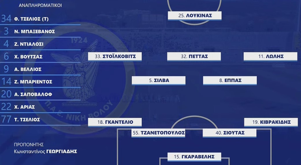 Νίκη Βόλου (Κώστας Γεωργιάδης): Γκαραβέλης, Κιβρακίδης, Γκαντέλιο, Τζανετόπουλος, Σιούτας, Έππας (46΄ Βουτσάς), Νταμιάν Σίλβα, Πέττας (85΄ Μπαριέντος), Λώλης (66΄ Σαποβάλοφ), Στοΐλκοβιτς (29΄ Ντιαλόσι), Λουκίνας (66΄ Βέλλιος).