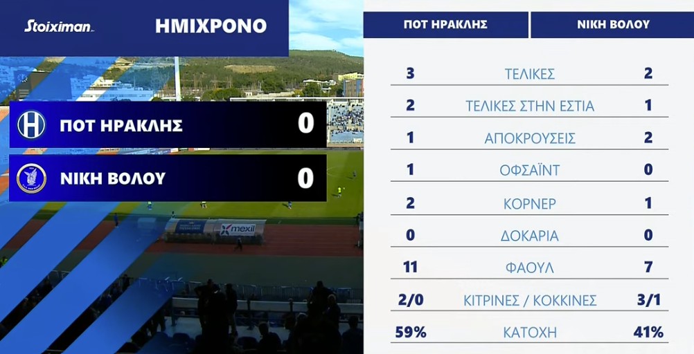 58′ Ο Γκαραβέλης κρατάρει όρθια και πάλι τη Νίκη Βόλου. Ο Μαχαίρας γέμισε στην περιοχή, ο Γκαντέλιο στην προσπάθειά του να διώξει έστρωσε στον Μάναλη, όμως ο τερματοφύλακας των φιλοξενούμενων θα προλάβει και θα διώξει πριν ο επιθετιικός του Ηρακλή, σπρώξει την μπάλα στα δίχτυα