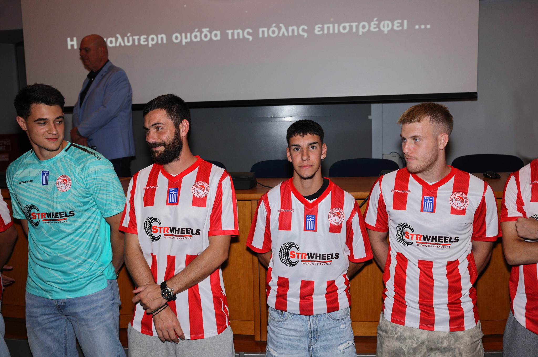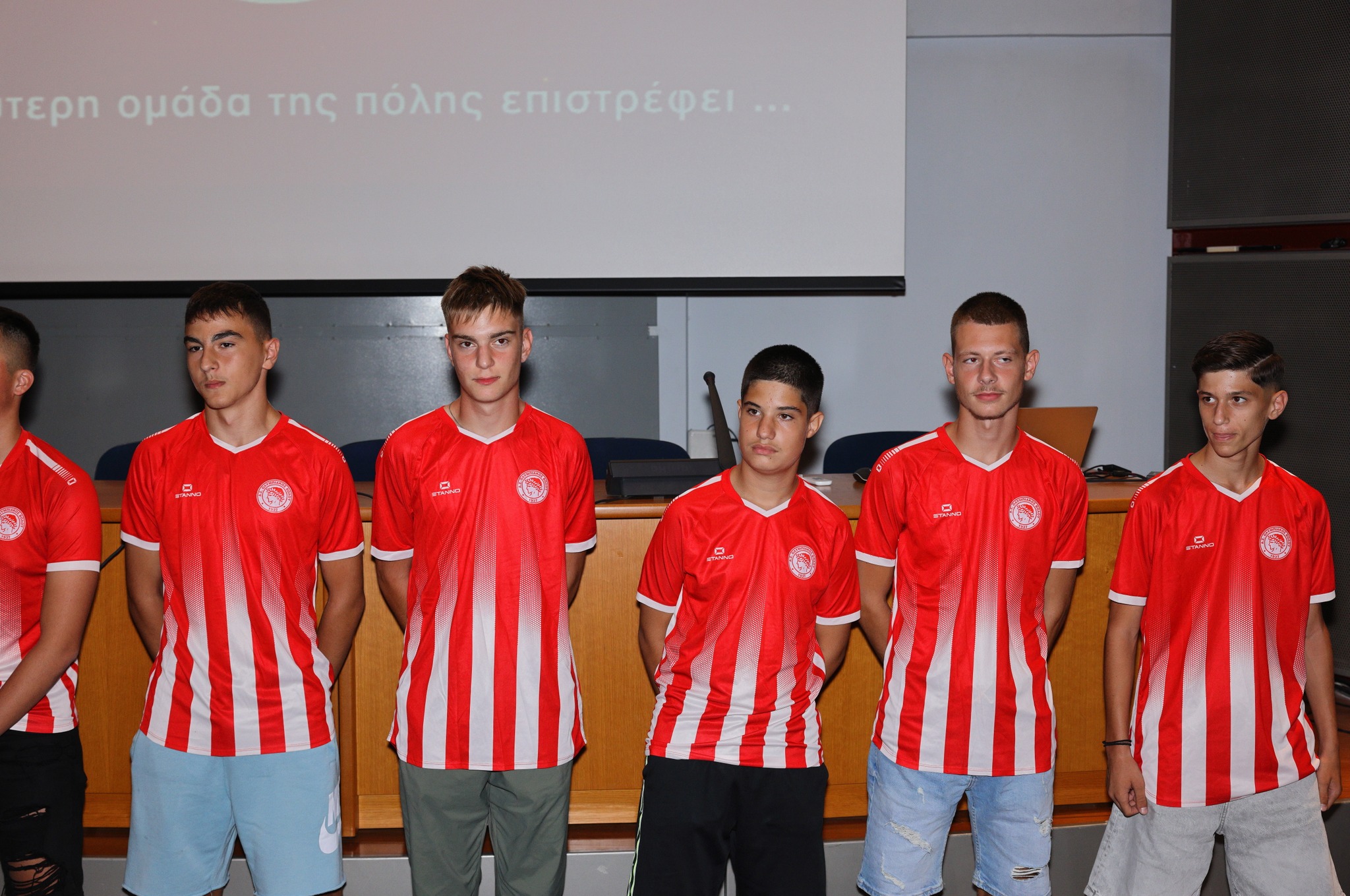 Οι νέες εμφανίσεις που παρουσιάστηκαν στην εκδήλωση είναι, αν μη τι άλλο,, εντυπωσιακές και ενθουσίασαν το κοινό. Η πρώτη είναι η κλασική ερυθρόλευκη με ρίγες και κόκκινο παντελονάκι. Η δεύτερη είναι λευκή, έχοντας δύο ιδιαιτερότητες. Στο πλευρό υπάρχει το έμβλημα του συλλόγου, ο “δαφνοστεφανωμένος Ολυμπιονίκης” και στο μανίκι μία φλόγα που θέλει να δείξει την αναγέννηση της ομάδας. Τέλος, υπάρχει και η τρίτη εμφάνιση χρώματος γκρι.