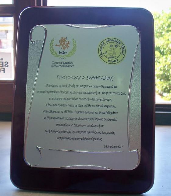Μεγάλη στιγμή για την ιστορία του Συλλόγου Δρομέων Υγείας Βόλου αποτέλεσε η αδελφοποίηση και το πρωτόκολλο συνεργασίας που υπογράφτηκε με το Σωματείο Δρομέων και άλλων Αθλημάτων «ΕΥ ΖΗΝ» Λεμεσού. Τη Κυριακή 30 Απριλίου, μία ημέρα μετά τη διεξαγωγή του 3ου Ημιμαραθωνίου Βόλου πραγματοποιήθηκε η εκδήλωση στην αίθουσα στο Μεταξουργείο.