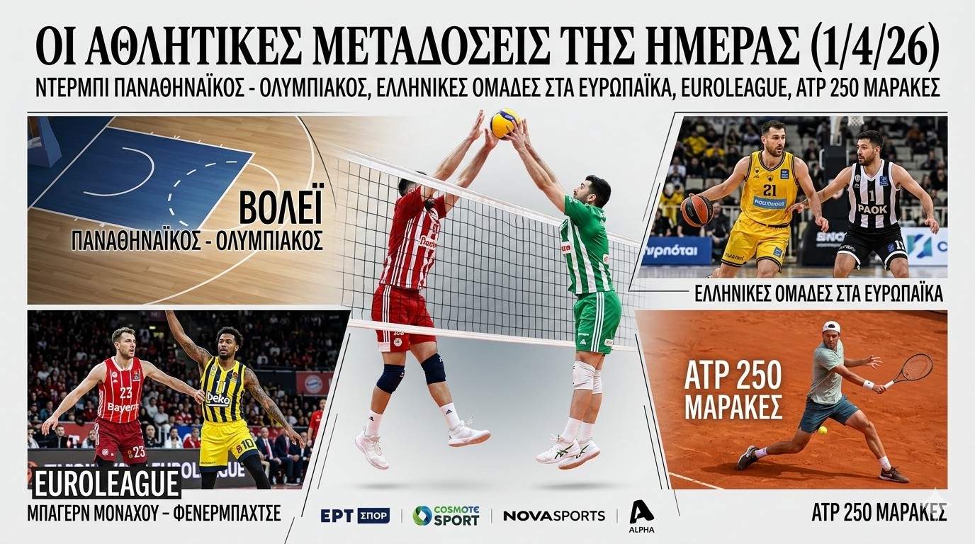 Με το μεγάλο ντέρμπι των «αιωνίων» στη Volley League Ανδρών να κλέβει την παράσταση και μια εξαιρετικά γεμάτη μπασκετική βραδιά σε Euroleague, Basketball Champions League και FIBA Europe Cup, το αθλητικό πρόγραμμα της Τετάρτης, 1 Απριλίου, αναμένεται συναρπαστικό.