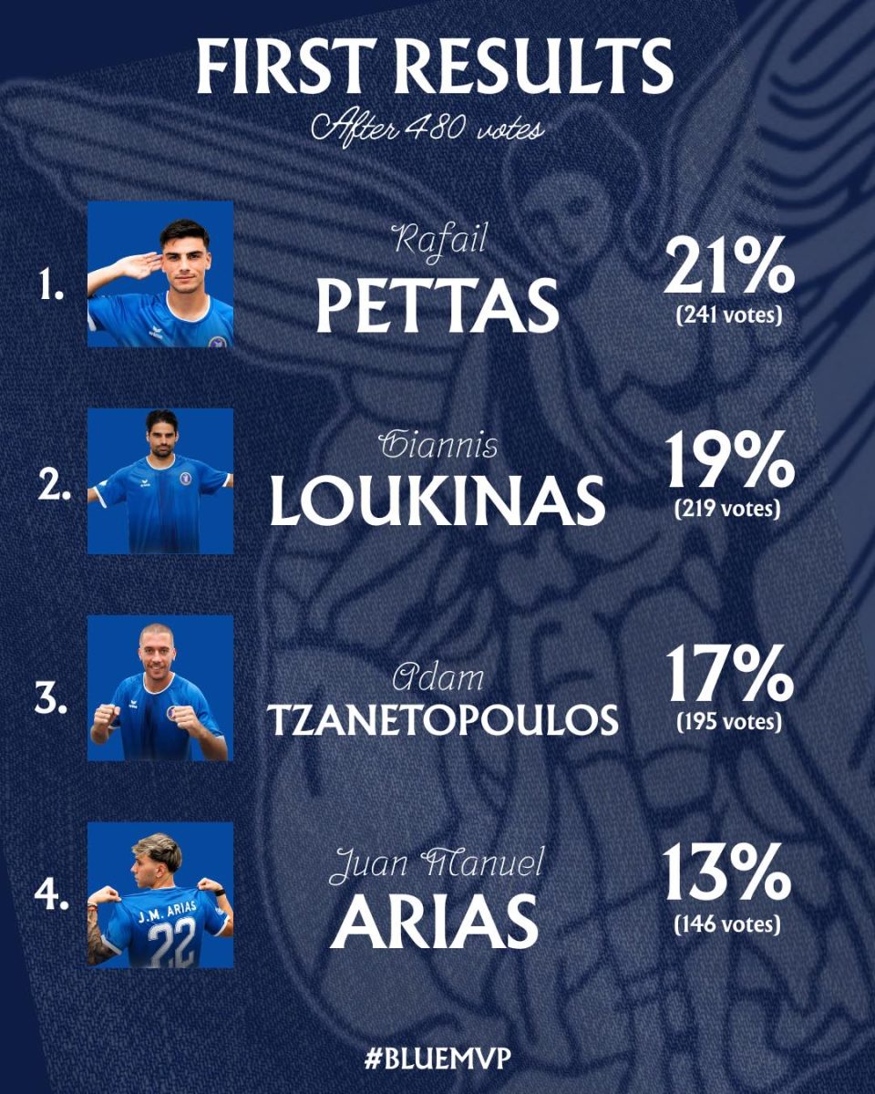 Ραφαήλ Πέττας, Γιάννης Λουκίνας, Άνταμ Τζανετόπουλος και Χουάν Αρίας οδηγούν την «κούρσα» για την ανάδειξη του Blue MVP 2025-2026, ύστερα από τέσσερις ημέρες ενεργής ψηφοφορίας και περίπου 500 ατομικές ψήφους! 🗳️🔵