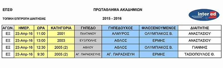 Εξ’ αναβολής αγώνες διεξάγονται σήμερα για τα πρωταθλήματα ακαδημιών “Intered” ΕΠΣΘ 2015-16, τελευταίο Σαββατοκύριακο πριν την ανάπαυλα των εορτών του Πάσχα. Το πρόγραμμα και ο διαιτητές που έχουν οριστεί στα τέσσερα σημερινά παιχνίσια, αναλυτικά…