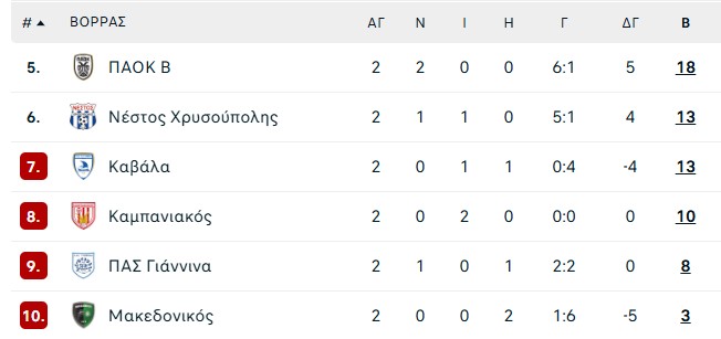 Σημαντική νίκη πέτυχε ο Νέστος Χρυσούπολης, ο οποίος επικράτησε με άνεση 5-1 του Μακεδονικού και ανέβηκε στους 13 βαθμούς, καταλαμβάνοντας τη δεύτερη θέση της βαθμολογίας. Την ίδια στιγμή, ο ΠΑΟΚ Β συνέχισε την καλή του πορεία, νικώντας εκτός έδρας τον ΠΑΣ Γιάννινα με 2-1 και παραμένοντας στην κορυφή. Αντίθετα, η εικόνα του ΠΑΣ δεν αφήνει πολλά περιθώρια αισιοδοξίας για τη συνέχεια και τη μάχη της παραμονής.