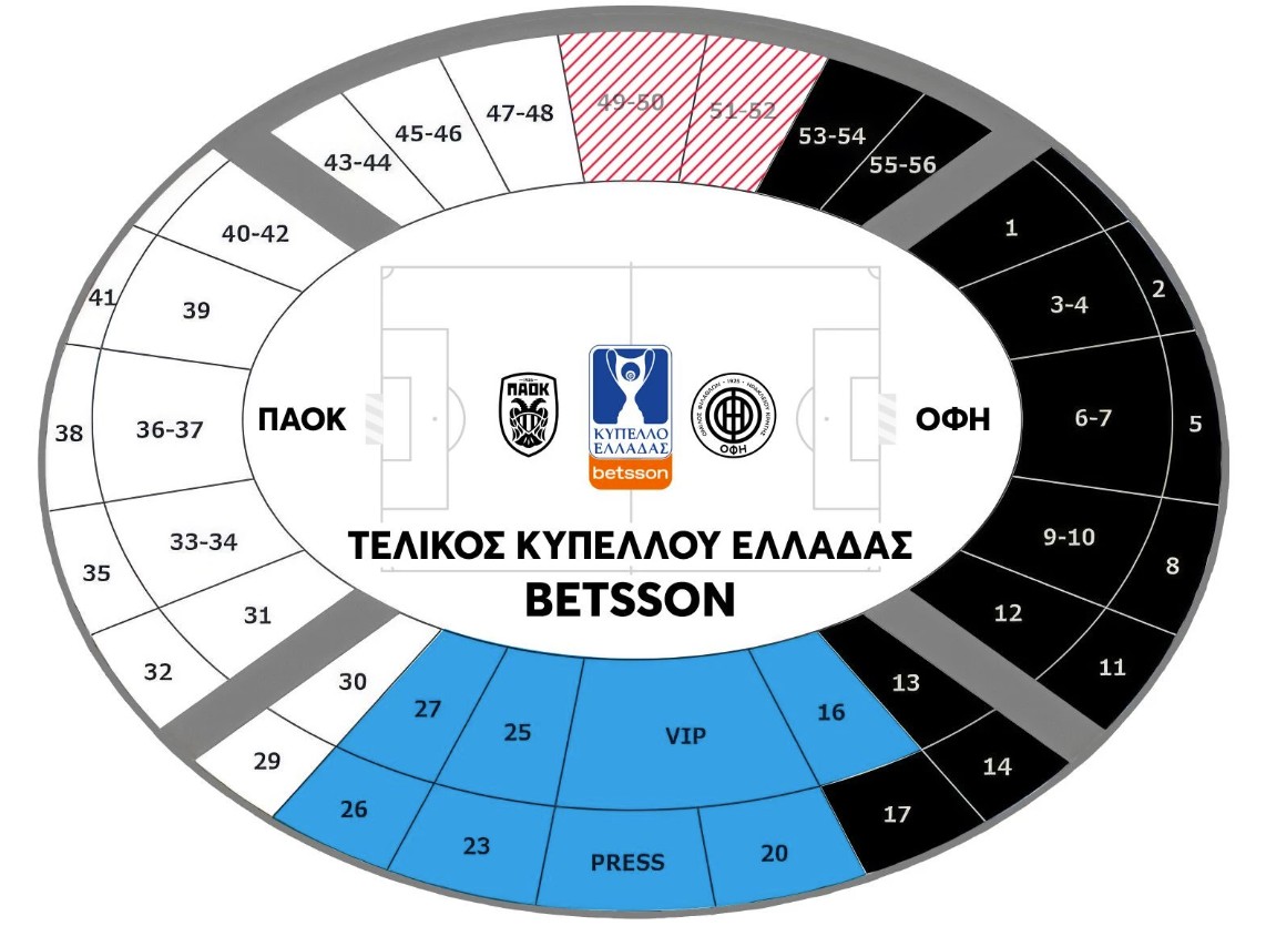 Οι φίλοι των Κρητικών θα φιλοξενηθούν στη νότια πλευρά του Πανθεσσαλικού Σταδίου και συγκεκριμένα στις θύρες 1 έως 14, τη θύρα 17 και στην απέναντι πλευρά στις θύρες 53 έως 56, ενώ από την απέναντι μεριά θα φιλοξενηθούν οι φίλοι του ΠΑΟΚ.