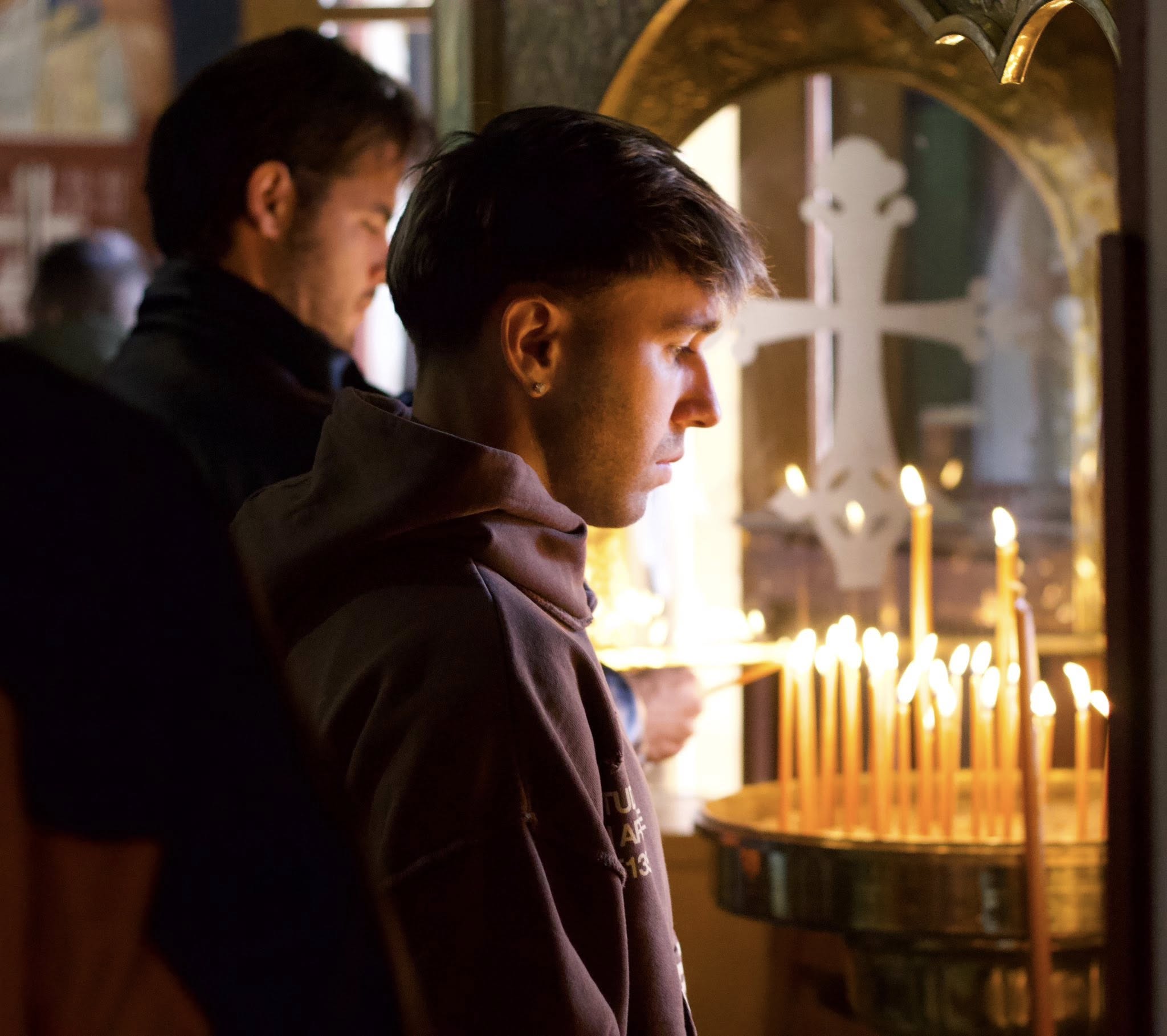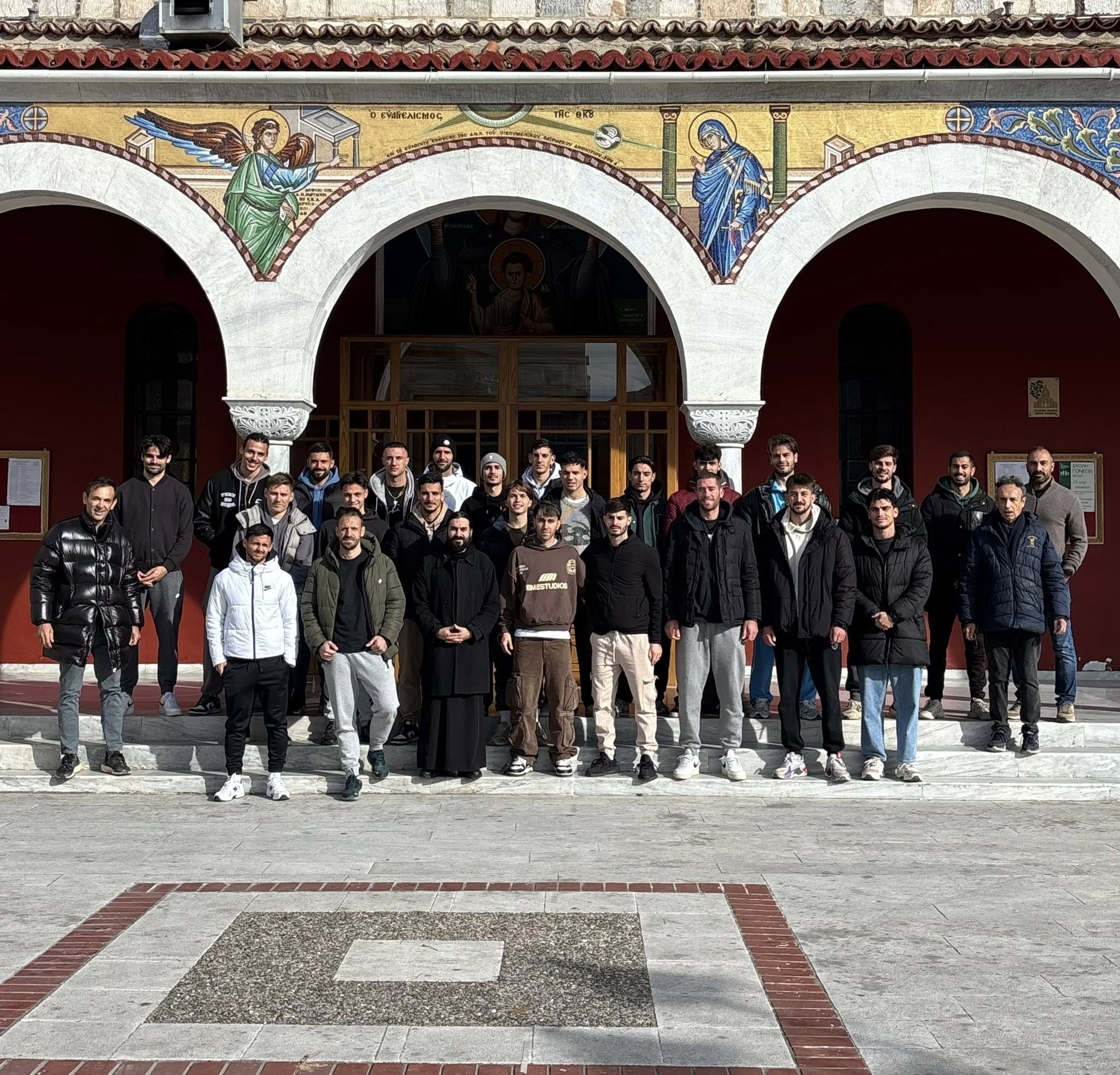 Τον αντιπρόεδρο της ΠΑΕ, κ. Βασίλη Βενέτη, το προπονητικό μας επιτελείο και τους ποδοσφαιριστές υποδέχθηκε ο Πατέρας Νεκτάριος, ο οποίος ευχήθηκε σε όλους υγεία, ευτυχία και… το πρωτάθλημα!